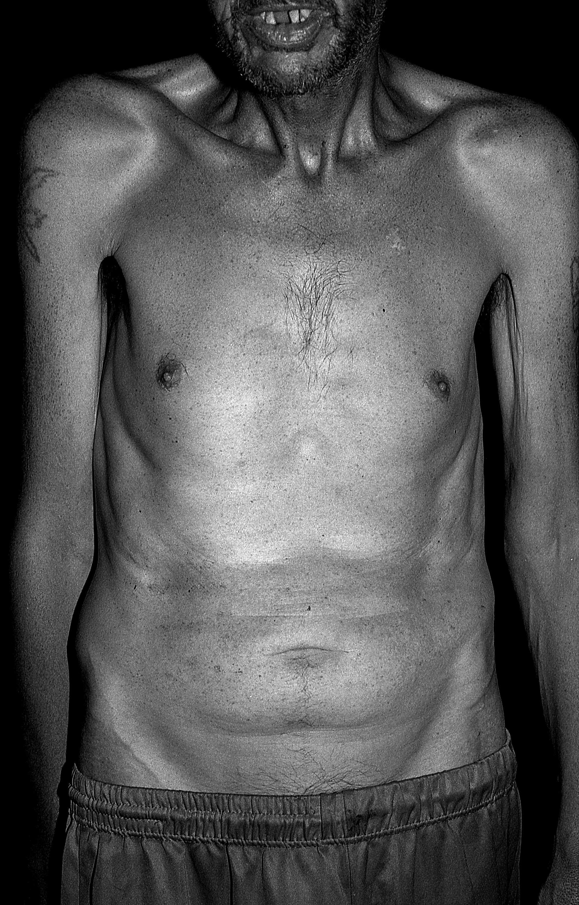 A black and white photo of a shirtless man from the waist up, showing his chest and abdominal muscles, with a tattoo on his right shoulder, and a smile revealing missing teeth.